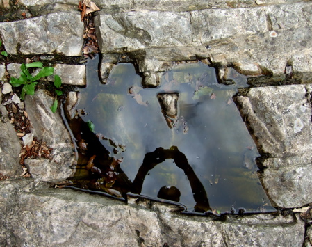 I nattens regnvatten finns lite spridda växter och spegling av en blåsig men solig himmel. Solen reflekteras i en osannolikt blank panna med högt hårfäste.