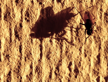 Flugan på väggen värmer sig i solens sista gulaktiga strålar. Den låter sig delvis reduceras till tvådimensionell bild mot väggen. Det tänker jag aldrig göra.