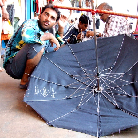 Men – med lite hjälp hittade jag något som faktiskt inger mig hopp. Mannen på bilden lagar paraplyer på marknaden vid Mapusa i Goa. Det går att försörja sig, det går att återvinna paraplyer, det går att skydda sig mot regn. De fattiga människornas påhittighet är världen hopp.