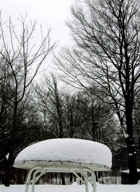 Väderleksrapportens konkretion hjälper mig att få grepp om det som vi kallar skånsk vinter. Jag skyndar mig ut och fotograferar ett översnöat bord. Formen påminner om något – något modernt?