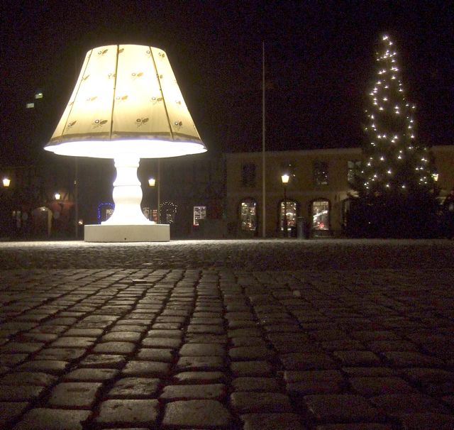 Efter mötet går jag hem över Lilla torg. Den stora lampan reflekteras i gatstenen och jag tänker att det finns ljus i mörkret.
