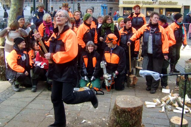 Jag tycker om att visa högskola för besökare och är stolt över våra fina lokaler. Vi går en tur på stan och möter en installation där 50 kvinnliga vedhuggare poserar på Stortorget. Jag tror att det har något med kvinnokraft och miljö att göra. På bilden svingar Karin Dackman yxan framför sina kamrater.