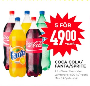 Runt läskedryckerna är det folksamling och vid utgången ringlar en kö av överviktiga. De handlande är märkvärdigt glada och deras vagnar är fyllda av tvåliters Cocacolaflaskor. Denna vecka kan du vid ett tillfälle köpa 30 liter för 150:-. Sedan får man ta på sig lösskägg och byta kassa om man vill köpa mer.