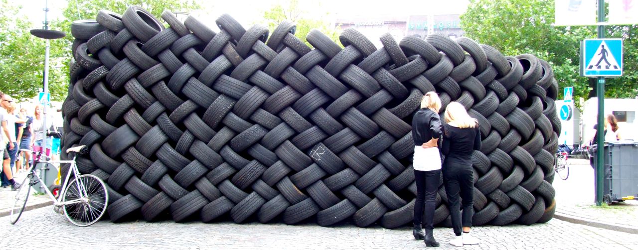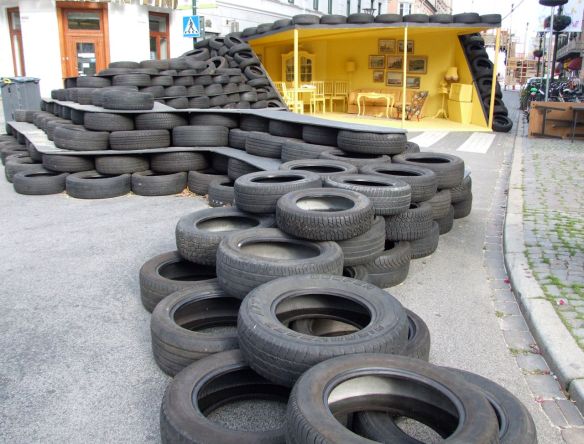 Där Hamngatan möter Stortorget finns en fantastisk vägg av bildäck.