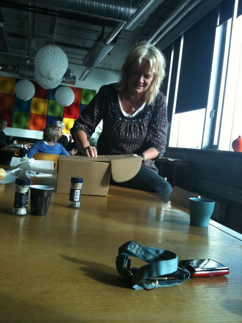 Pia har hittat en plocklåda som hon tänker träna barnbarnets motoriska och perceptuella utveckling med men först måste hon sätta ihop den. Fem kollegor följer arbetet med intresse.