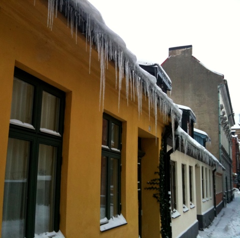 Det är trots allt väldigt vackert med istappar. 🙂 De enda tappar vi har är det lilla som sticker upp av våra solstolar och övriga trädgårdsmöblemang. Fåglarna tycker om att sitta där, så i morgon ska jag se om jag kan kasta en dit kärve från altandörren. God Jul, Mats!