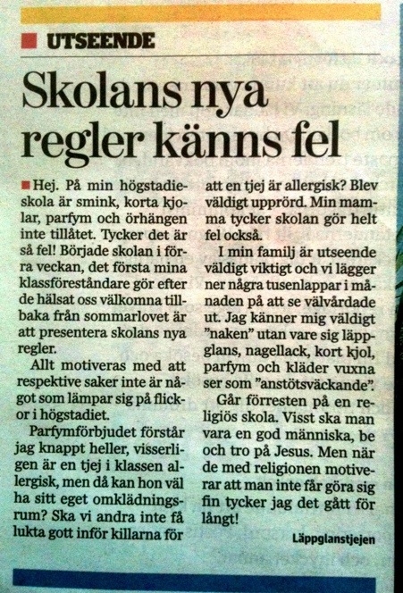 Egentligen undrar jag om det inte är någon form av satir? När en rektor i Göteborg hade åsikter om hur flickorna på skolan klädde sig hamnade det på löpsedlarna. Att hon dessutom går på en kristen högstadieskolan trots att föräldrarna är mot moraliska regler tycks märkligt.