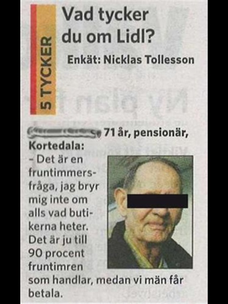 Såg en liknande sådan för snart fjorton år sedan. Frågan löd “Brukar du handla ekologiska varor?” Gubbe med smäck svarar “Jag handlar inte. Jag är gift sedan många år.”