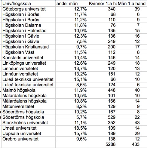 I tabellen har jag räknat ut andelen män i procent av de totala söktalen. Siffrorna till höger gäller förstahandssökande. Jag har sorterat bort en del distansutbildningar med små antagningar.