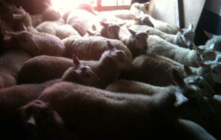 Lammen tycker om att vara nära varandra men sprattlar vilt på vågen. Till sist lyckas jag läsa av mätaren och ägarna gläds över viktökningen. De lamm som väger över 40 kilo (och inte ska användas till avel) märks med röd färg i pannan och skickas till slakt. Tur att jag är van att sätta betyg.