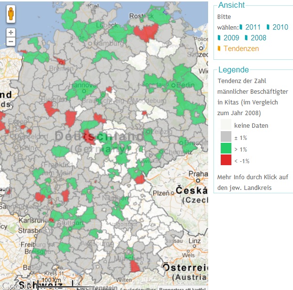 Förhoppningsvis kommer landets lärarutbildningar att vara en viktig del av det här arbetet. Det finns mycket att ta igen. Det tyska exemplet är mycket inspirerande. Vi kan gå in och följa utvecklingen på kommun- och delstatsnivå. Andel män och förändring illustreras grafiskt. Länk