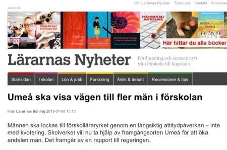 Jag har arbetat i Norge. I flera år faktiskt. Och det är inte så att män gör andra saker än vad kvinnor gör. Var kommer den uppfattningen ifrån? Man kan göra lite olika saker, men på det stora hela gör man samma saker. Och just för att man är två kön på arbetsplatsen så blir dynamiken mycket större och öppenheten för olikheterna mellan könen blir mer tolerant. Och fokus ligger på att ha roligt och att det är barnen som är viktiga. Inte som i Sverige där underlig dokumentation som ingen läser är viktig. Eller dessa evinnerliga genusdiskussioner som inte leder varken framåt eller bakåt är viktigare än barnen. Kanske Skolverket ska ställa sig frågan om det är rätt kvinnor som blir förskollärare? Själv skulle jag kunna plocka bort 50% av yrkeskåren utan att blinka och be dem gå och se sig om efter ett annat yrke. Nej, en sådan tuff fråga skulle aldrig den överbetalda Mia Heikkilä aldrig våga ställa sig! Är det rätt kvinnor som arbetar i förskolan?