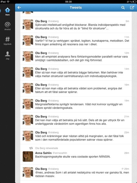 Poängen att det i dagens Sverige tycks vara omöjligt att få igenom en diskussion som jobbar med flera parametrar, flera olika förklaringsmodeller är viktig. Jag har också det intrycket, för att debattböcker ska anses fungera idag så måste de spika en tydlig tes redan på de första sidorna och sedan driva den stenhårt med täta återkopplingar hela vägen – att skriva debatt- eler essäböcker just utifrån ett problemfält, och med en vilja att granska olika aktörer och deras idéer, det anses inte hålla längre.
