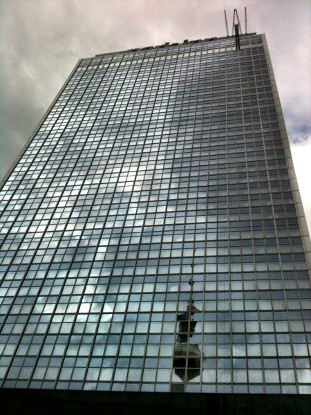 Vi vandrar förbi Alexanderplatz och ser tevetornet speglas i hotellfasaden.