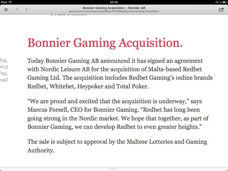 Bonnier – corporate branding Posted on May 22, 2013 by Editor Företaget har stolta anor och presentationen på hemsidan är aningen pompös. Därför är det lite förbryllande att de prålar med sin satsning på maltesiska pokersajter. Bonnier Gaming – Acquisition of RedBet, Whitebet, HeyPoker & TotalPoker – http://t.co/KAmZper8iB @RedbetCasino @RedBetSports — MonkeesBlood (@Monkeesblood) May 22, 2013 Tweet Click to email a link to a friend (Opens in new window) Email MoreLike Loading...