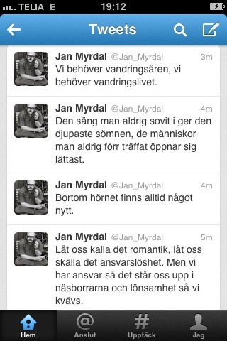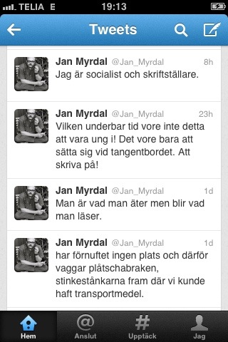 En bra dag för Jan Posted on May 25, 2013 by Editor 1976 hörde jag Jan Myrdal debattera med Maria Bergom Larsson på Sparta i Lund. De var ohyggligt arga på varandra, men jag minns inte varför. Det känns som om Myrdal vinner på poäng och uthållighet. Tweet Click to email a link to a friend (Opens in new window) Email MoreLike Loading...