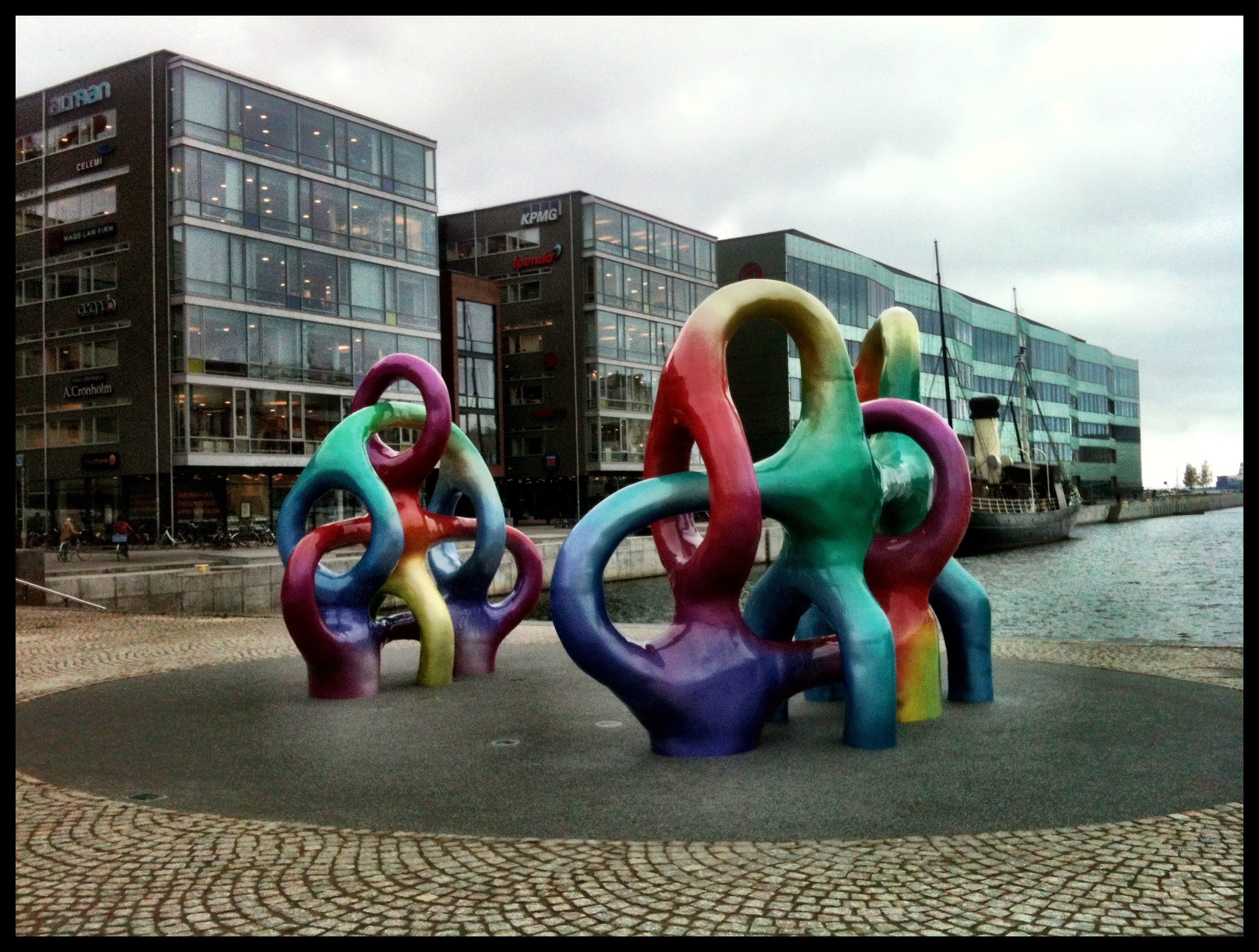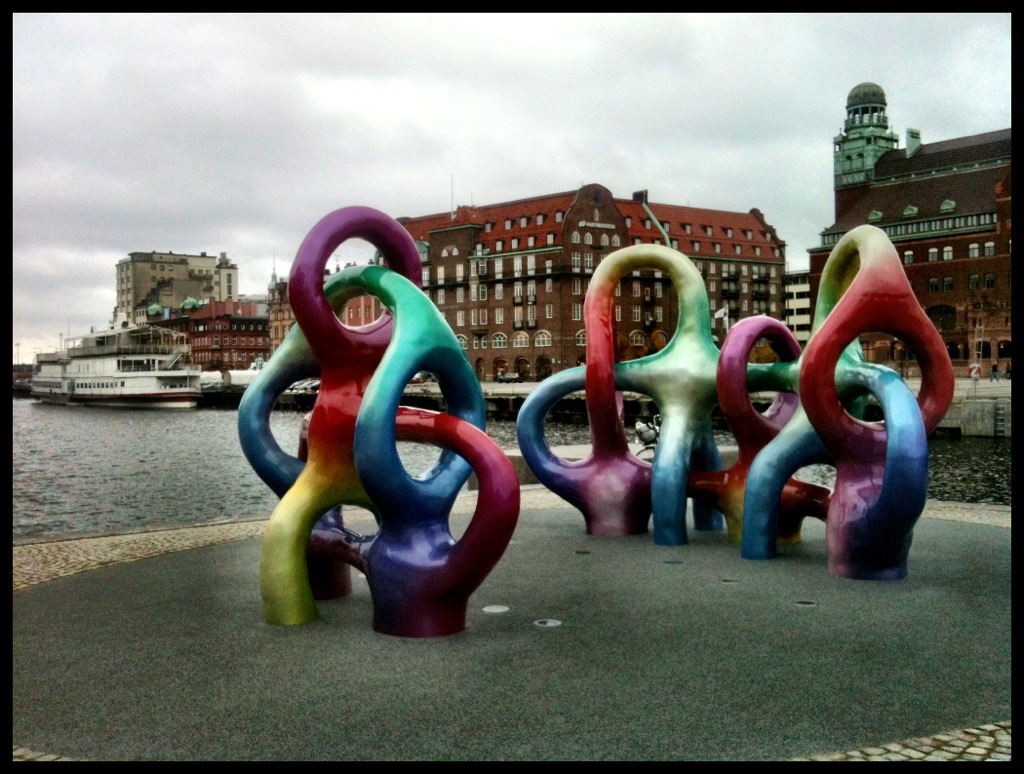 Är det två regnbågsfamiljer som trängs på samma kaj framför en trave fyrkantiga glaslådor?