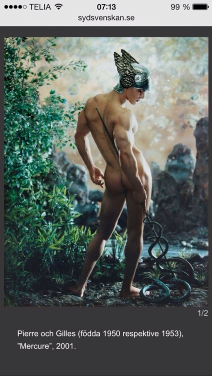 “….I sista rummet, i grevens tid, kommer samtiden in på bred front. Paul Cadmus, David Hockney och flera andra vecklar ut det homosexuella perspektivet. Förvisso har detta kommit på tal redan tidigare i utställningen, men utan problematisering. Helt frånvarande är teoribildningen om queerfältet och den metrosexuelle mannen, en heterosexuell storstadsman som blandar genuskodade attribut och tilltalar kvinnor såväl som män, oavsett läggning. Vidare är det chockerande att inte den kvinnliga blicken på mannen uppmärksammats mer än med enskilda bilder av Nan Goldin och Orlan.