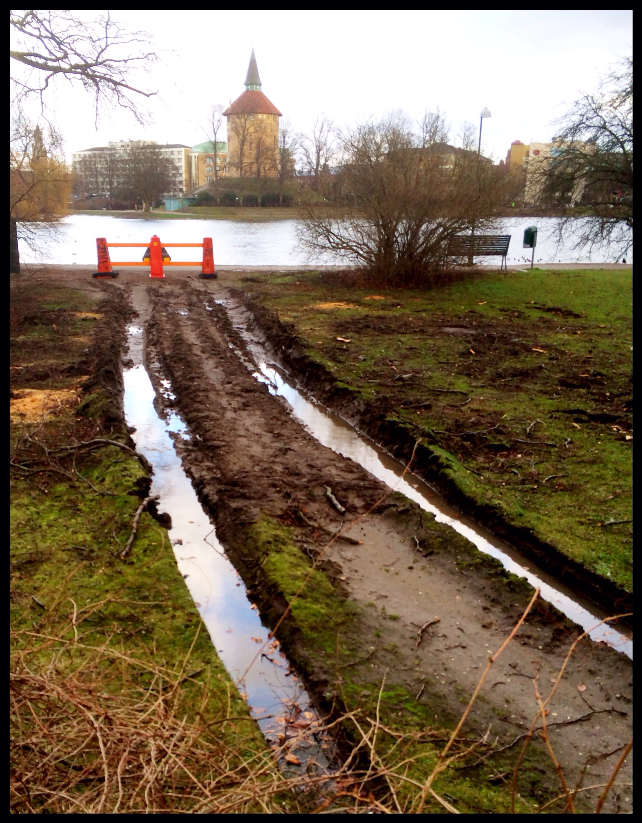 Margaretapaviljongen är historisk mark. Utanför fönstret syns spåren efter stormen. På andra sidan dammen ligger vattentornet.