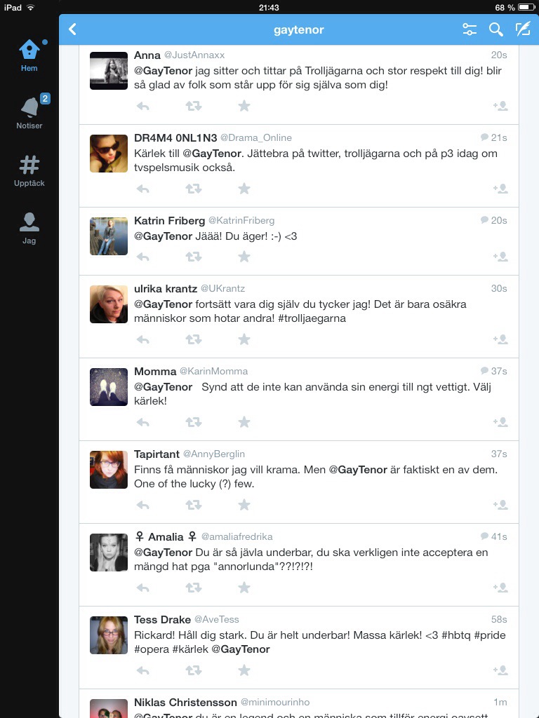 Hos Trolljägarna berättar Richard Söderberg om hatet han möter. Jag söker på @gaytenor och inser att många tycker om honom.