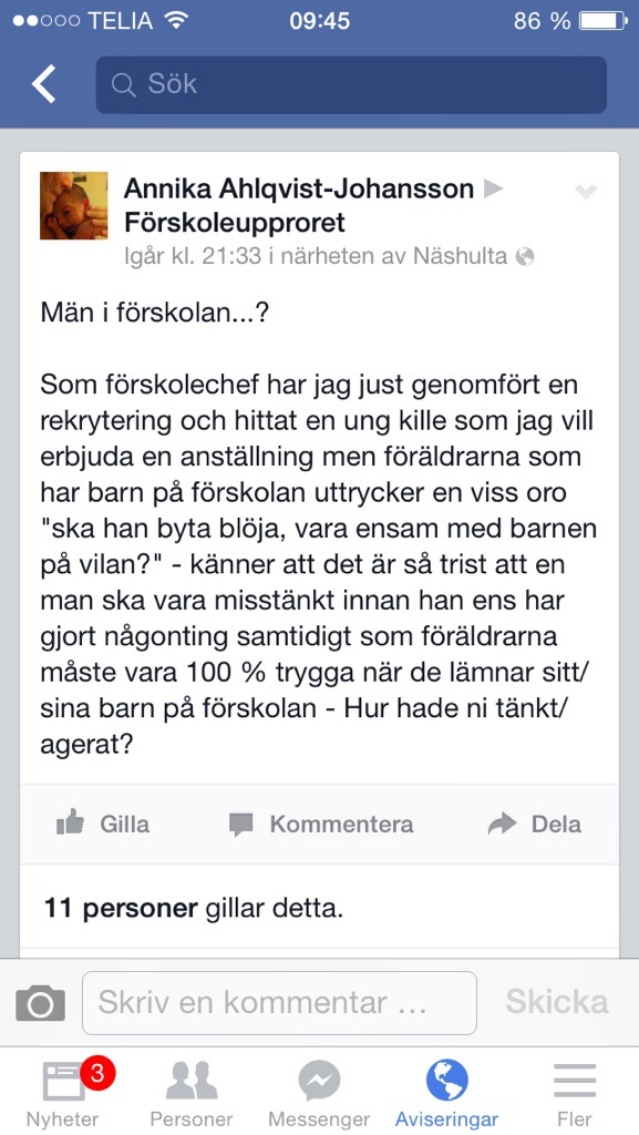 Frågan om män i förskolan engagerar Posted on May 31, 2014 by Editor Jag gissar att många av er även följer den här gruppen? Het debatt ang män i förskolan i Förskoleupproret- https://www.facebook.com/groups/230132357146038/ Tweet Click to email a link to a friend (Opens in new window) Email MoreLike Loading...