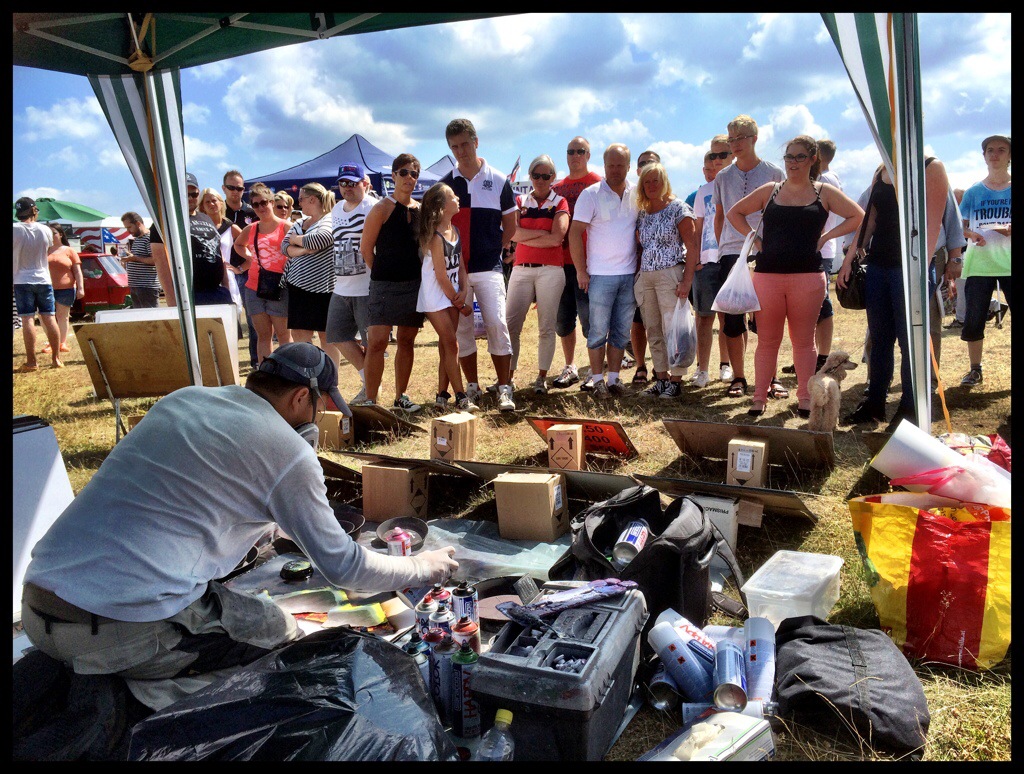 Bakom vårt stånd spraymålar en kille på löpande band. Publiken applåderar andäktigt.