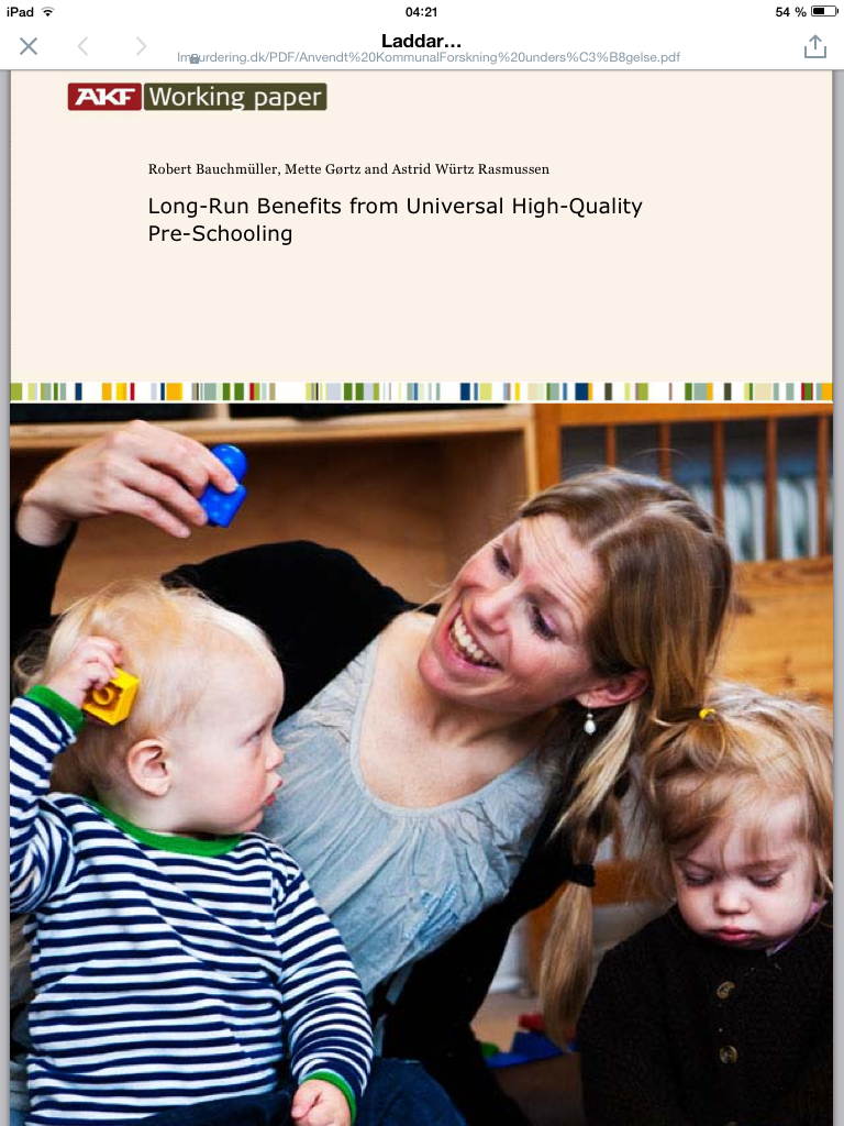 En bra förskolas långsiktiga effekt Posted on August 13, 2014 by Editor Danish preschool benefits children more when groups are small, with more male teachers, and teachers are qualified: http://t.co/I34ssCzoV5 — Dylan Wiliam (@dylanwiliam) August 12, 2014 Tweet Click to email a link to a friend (Opens in new window) Email MoreLike Loading...