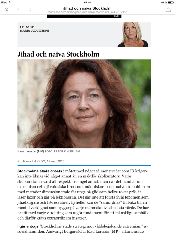 Det hela vore inte fulländat utan en av genusobligatoriets bisatser: ”Oavsett bakomliggande anledning behöver arbetet för att motverka våldsbejakande extremism utvecklas strategiskt. Och det är viktigt att i detta arbete beakta ett genusperspektiv. (…) Stadens insatser ska inrymma ett genusperspektiv för att säkerställa att stödet anpassas till allas behov.”