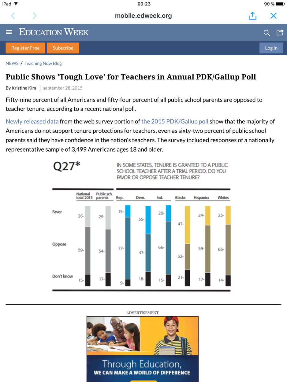 Det amerikanska folkets syn på anställningsskydd för lärare Posted on September 29, 2015 by Editor Länk Jag ska aldrig mer klaga. Påminn mig om jag glömmer. Tweet Click to email a link to a friend (Opens in new window) Email MoreLike Loading...