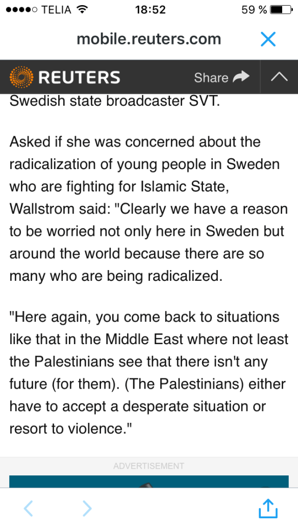 Jag är väl lite trög men vad var det som var farligt med detta uttalande. Palestinierna har ju levt i otrygghet under lång tid. Klart att vissa då blir desperata och kan tillgripa våld.