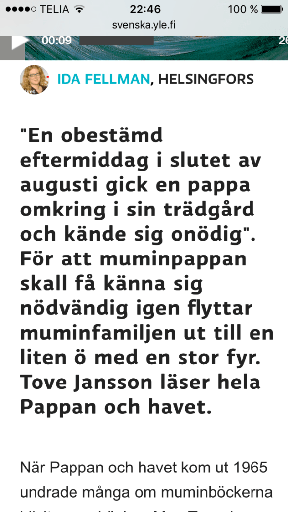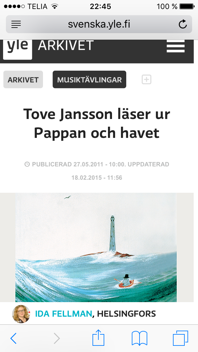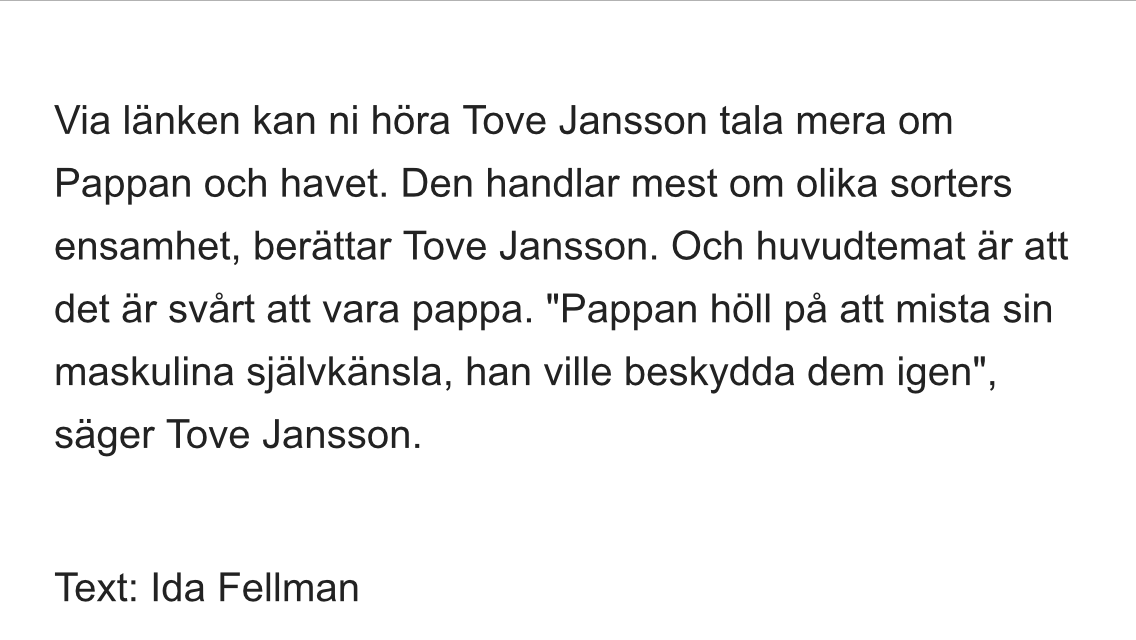 Att känna sig överflödig Posted on December 13, 2015 by Editor Tänk att lysa för båtar som aldrig går förbi… Länk till Tove Jansons uppläsning. Tweet Click to email a link to a friend (Opens in new window) Email MoreLike Loading...