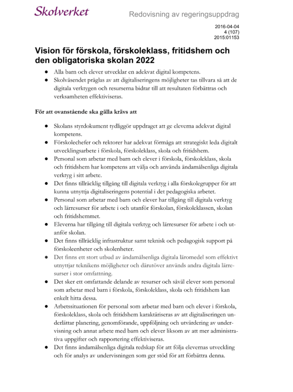 “Skolväsendet präglas av att digitaliseringens möjligheter tas tillvara så att de digitala verktygen och resurserna bidrar till att resultaten förbättras och verksamheten effektiviseras.”
