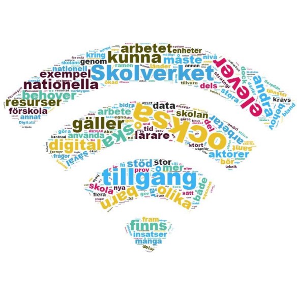 Emil Jansson har gjort en Wordcloud av texten. Jag saknar Skolverkets tankar om digitalisering i samband med lek, skapande, delaktighet, etik och omsorg. Risken finns att vi hamnar i en mycket traditionell syn på datorn som träningsredskap.