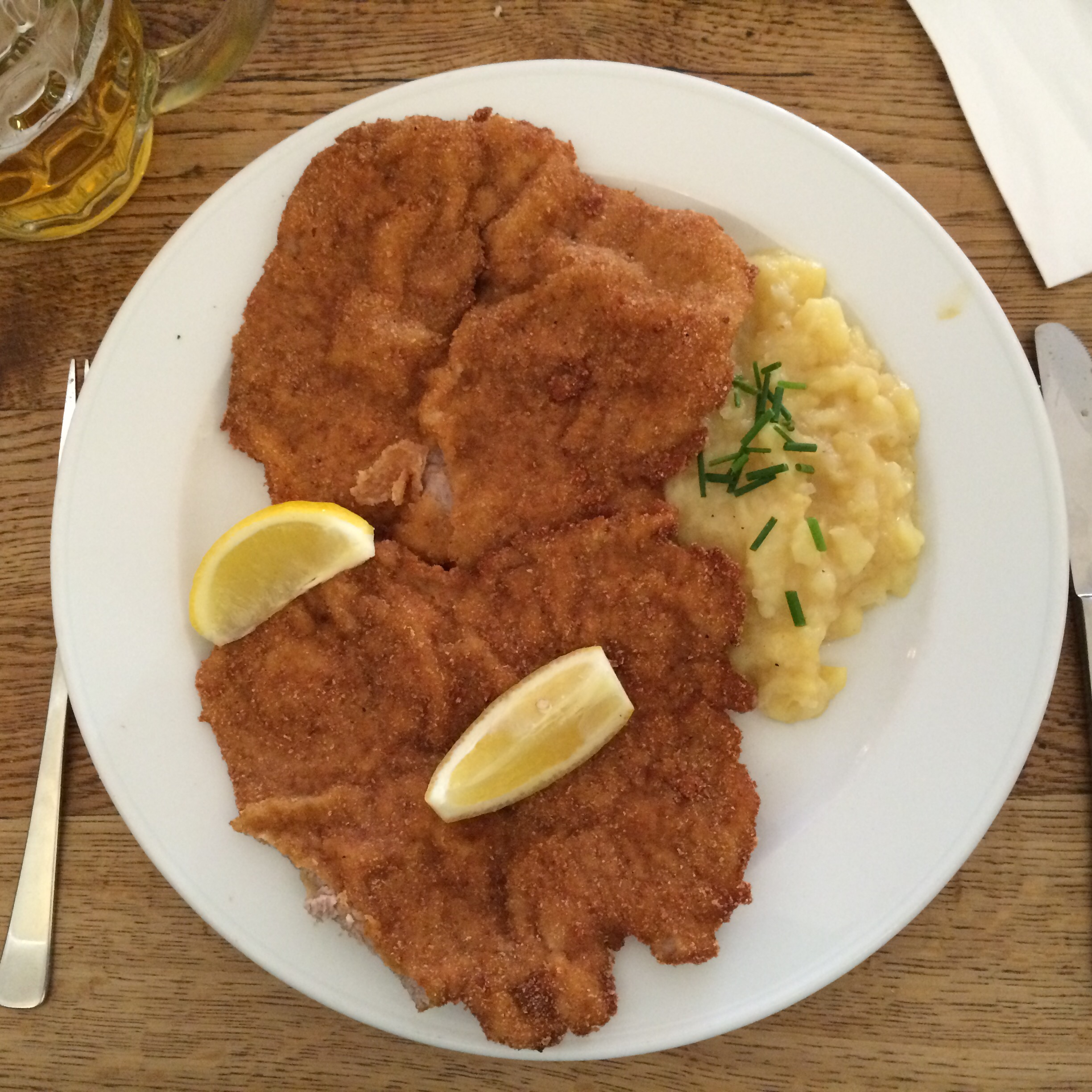 Vi tröstar oss med wienerschnitzel på Prater – Berlins äldsta ölträdgård.