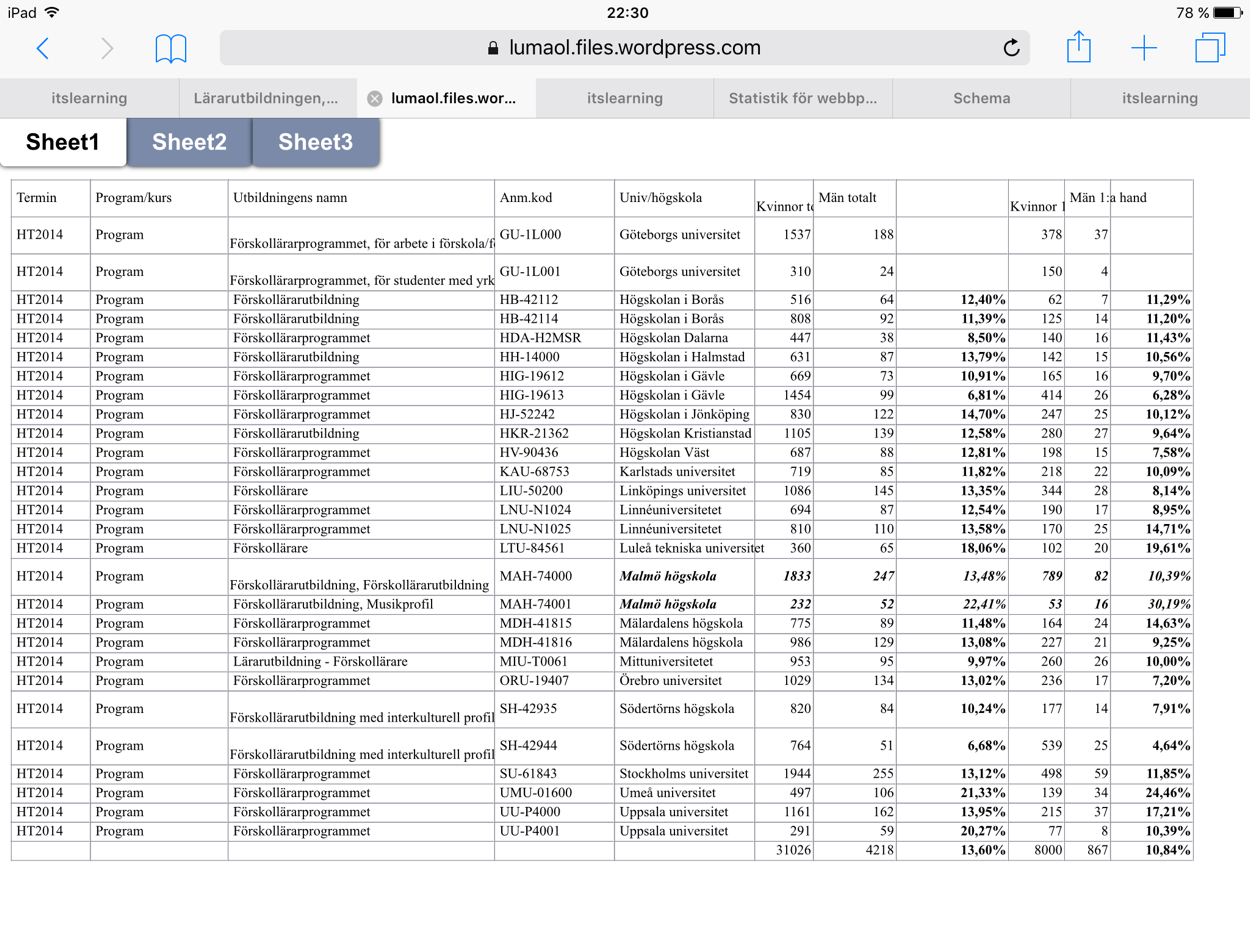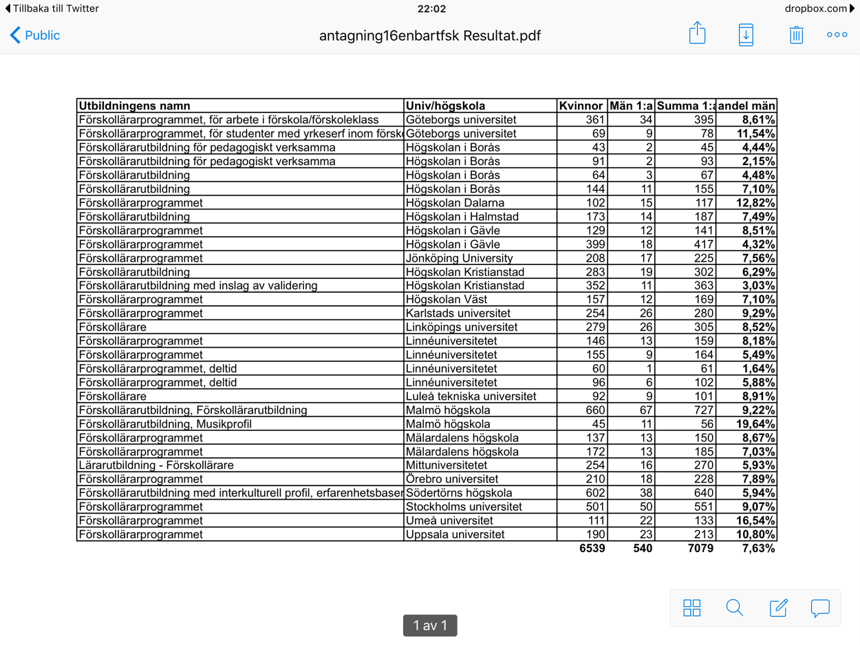 Som pdf med procenttal för män.(både grundlärare 1-3/fökl och förskollärarutbildning)