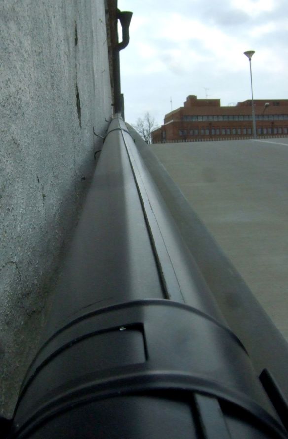 På andra sidan uppfarten löper ett stuprör. Här brukar fiskmåsarna bygga bo.