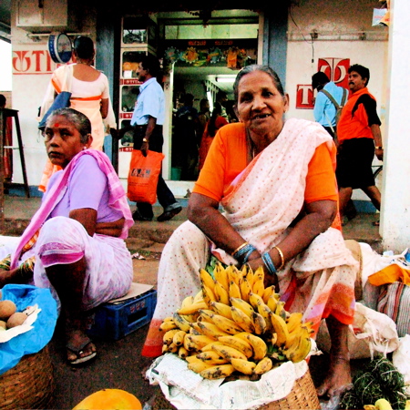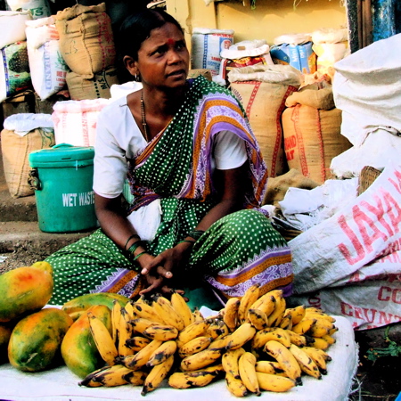 Fruktförsäljerska i Panjim – stormväder inbjuder till arkivdyk.