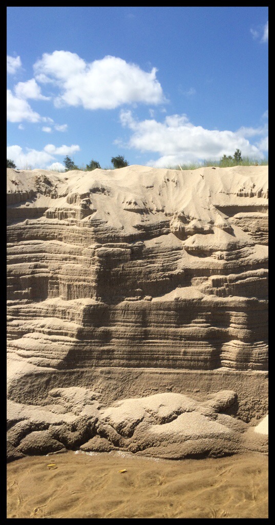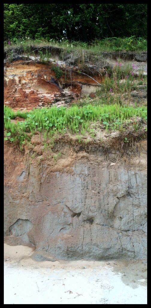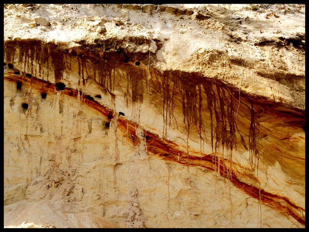 Vi vandrar norrut över skjutfältet. Bäckens sidor påminner om storslagna raviner – i mycket liten skala.