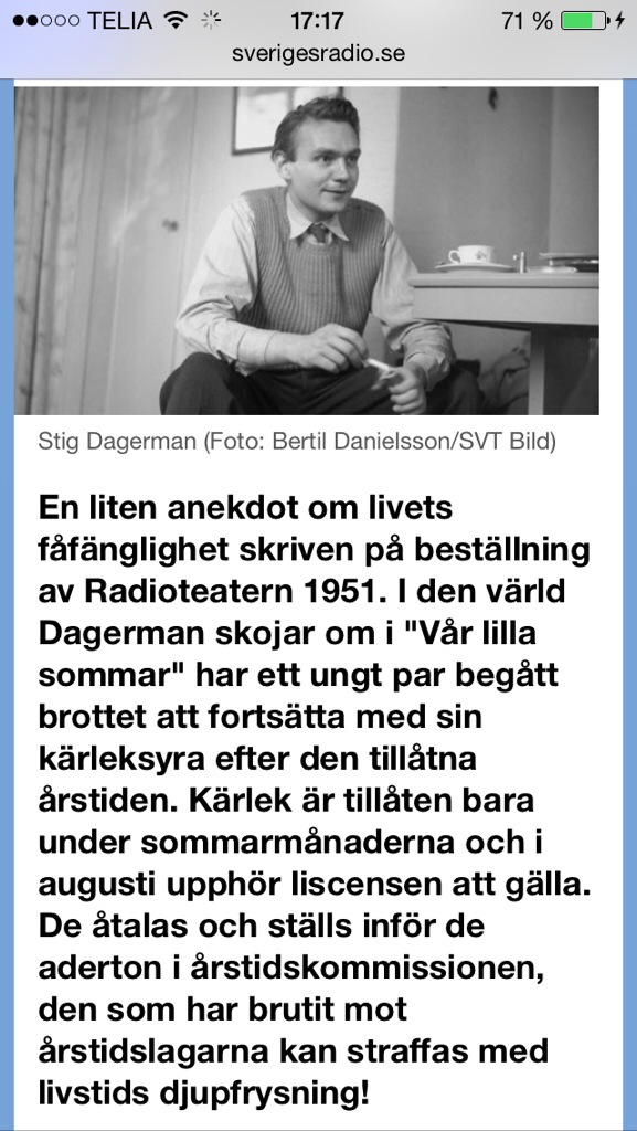 Jag läser en artikel om författarens situation 1951 och blir gripen av desperationen. Skrivkrampen har drabbat Dagerman och slutet närmar sig.