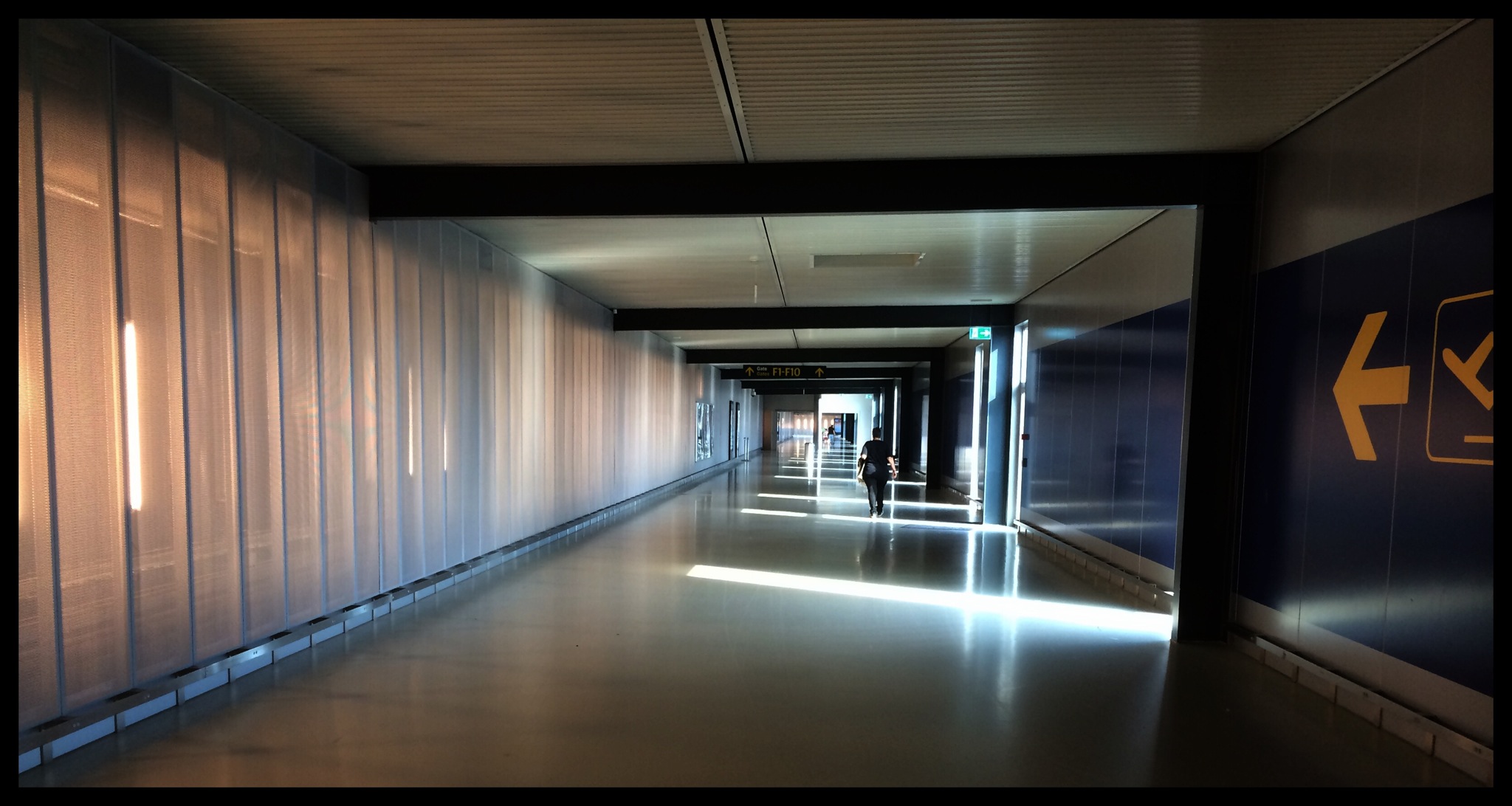 Kastrup är en långdragen flygplats. Jag har tappat en skärbräda på stortån och släpar mig fram genom gångarna.
