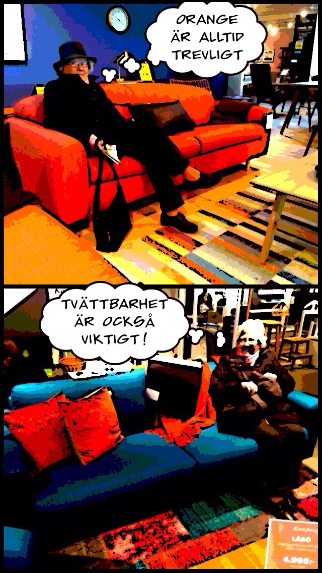 Mamma och jag har full koll på utbudet. I den fina affären talar försäljaren med vördnad om bröderna Anderssons soffor.