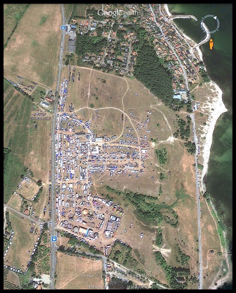 Jag gissar att bilden ovan är tagen kvällen innan Kiviks marknad. Karuseller och en del marknadsstånd är uppsatta. Det låga antalet bilar på parkeringsplatserna tyder på att besökarna inte har kommit än. Snart bryter kaoset ut.