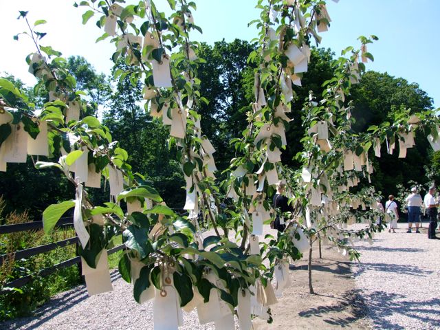 Jag gillar raden av fruktträd och Yoko Onos uppmaning att skriva ner våra önskningar på lappar som vi hänger upp i grenarna. Vi blir först generade och försöker distansera oss från situationen. Sedan grips vi av allvaret och skriver verkligen ner en önskning från hjärtat. Någon vill ha fred på jorden – andra nöjer sig med en åkgräsklippare.