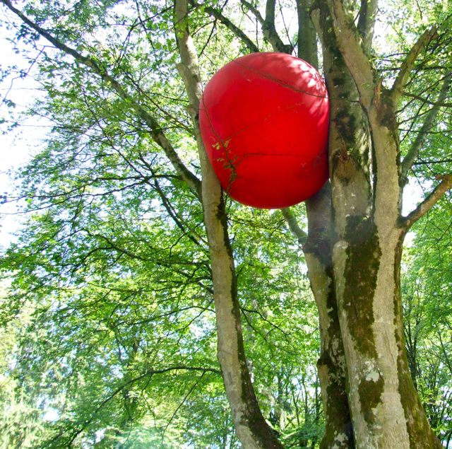 I bokskogen har en en konstnär klämt fast bollar i trädkronorna. Jag ger mig – det är roligt och lekfullt.